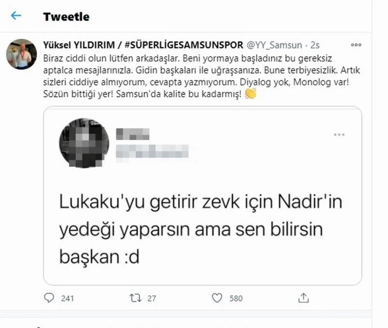 SAMSUN (İHA) – Samsunspor A. Ş. Yönetim Kurulu Başkanı Yüksel Yıldırım, bir taraftarın sosyal medyadan, “Lukaku’yu getir zevk için Nadir’in yedeği yaparsın” paylaşımına sinirlenerek tepki gösterdi.