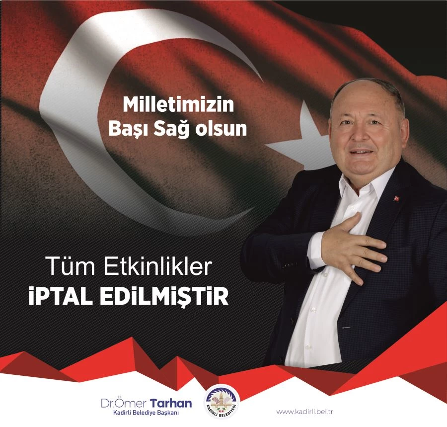 Kadirli Belediye Başkanı Ömer Tarhan Mübarek Regaip Kandili’nde Suriye’nin İdlip Kentinde Rejim Güçlerinin hava saldırısında 33 Kahraman Mehmetçiğimizin şehit düşmesi nedeniyle Kadirli’nin Düşman işgalinden kurtuluşunun 100. Yıl dönümü nedeniyle düzenlenecek konser ve etkinliklerin tamamının iptal edildiğini açıkladı.