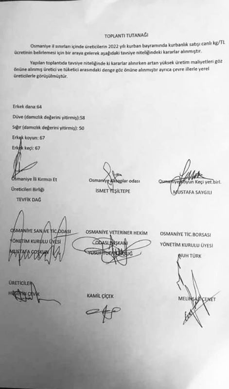 Başkan Yeşiltepe; "bu alınan fiyat kararına imzamı istemeyerek attım. Ben toplantıya gittiğimde toplantı bitmek üzereydi. Dolayısıyla ben buradan üyelerime sesleniyorum "Osmaniye il genelinde ki kurbanlık satış fiyatlarında ilk aldığımız karar geçerlidir.