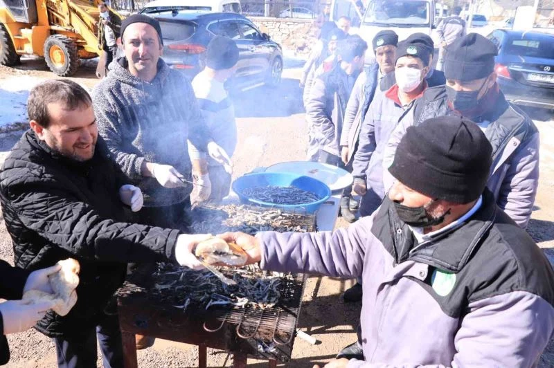 Başkandan karla mücadele eden işçilerine balık ziyafeti