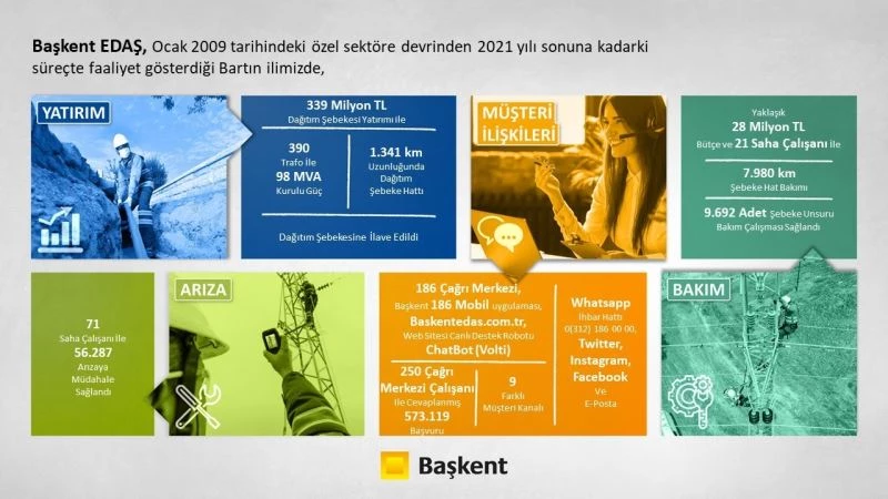 Başkent EDAŞ elektrik dağıtım faaliyetlerinin özel sektöre devredildiği 2009’dan 2021 yılı sonuna kadar Bartın özelinde 339 milyon lira tutarında yatırım gerçekleştirdi. Elektriğin modern hayatın her aşamasında taşıdığı önemin bilinciyle çalışmalarını sürdüren şirket, mevzuata tam uyumla yerine getirdiği faaliyetleri çerçevesinde yeni yatırımları devreye aldı, ayrıca şebeke ve ekipmanların bakımlarını da tamamladı.