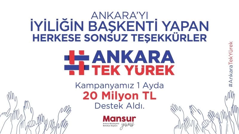 Ankara Büyükşehir Belediyesinin başlattığı “6 Milyon Tek Yürek” kampanyasına hayırsever bağışları her geçen gün artıyor. Ülke sınırlarını aşan kampanya ile toplanan tutarın 1 ayda 20 milyon TL’yi geçtiği açıklandı.