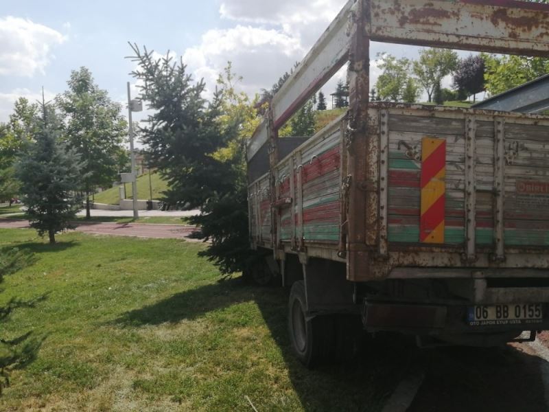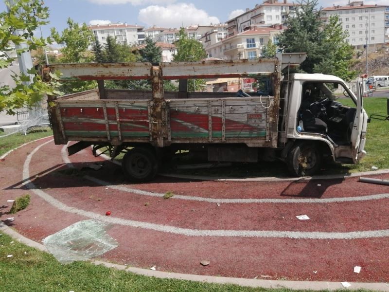 Başkent’te freni boşalan bir kamyon parka girdi. Kamyon, parktaki ağaçlara çarparak durabildi.