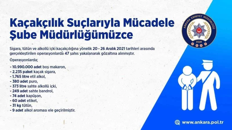 Ankara Emniyet Müdürlüğü Kaçakçılık Suçlarıyla Mücadele Şube Müdürlüğü ekiplerince, sigara, tütün ve alkollü içki kaçakçılığını önlemeye yönelik 20-26 Aralık tarihleri arasında gerçekleştirilen operasyonlarda 47 şüpheli gözaltına alındı. Edinilen bilgiye göre, operasyonlarda 10 milyon 990 bin boş makaron, 2 bin 235 paket kaçak sigara, bin 765 litre etil alkol, 380 adet puro, 373 litre sahte alkollü içki, 249 adet sahte bandrol, 74 adet kapüşon, 60 adet etiket, 31 kilo tütün ve 9 adet alkol aroması ele geçirildiği öğrenildi.