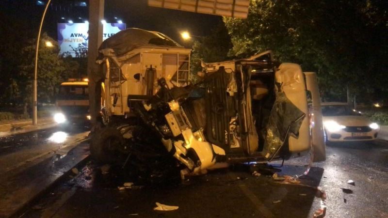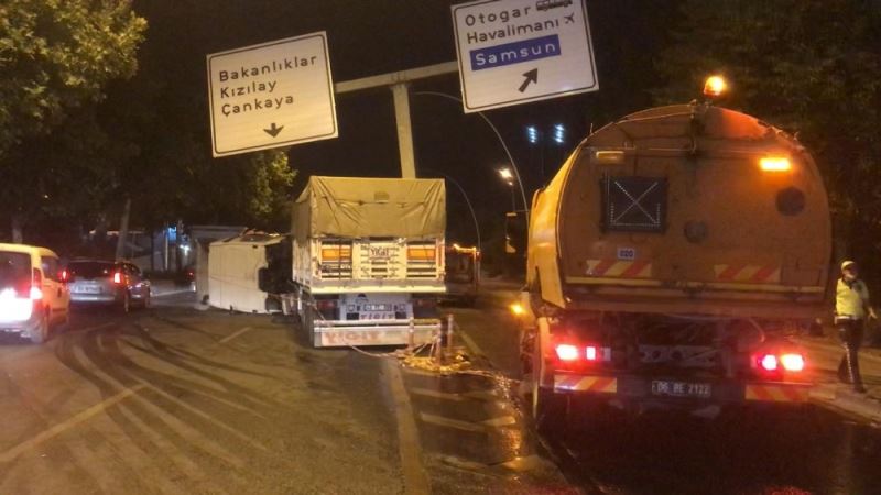 Kaza Ankara’nın Çankaya İlçesi Dumlupınar Bulvarı’ndan Kızılay istikametinde meydana geldi. Kimliği henüz belirlenemeyen 43 FT 591 plakalı kamyon sürücü direksiyon hakimiyetini kaybederek yol ayrımındaki direğe çarptı. Çarpmanın etkisiyle kamyonun ön tarafı yan yattı. Kazayı gören diğer sürücüler polis ve 112 Acil Servis ekiplerine haber verdi. Olay yerine gelen sağlık ekipleri yaralı sürücüye yaptıkları ilk müdahalenin ardından Gazi Hastanesi’ne sevk etti. Trafik akışının kontrollü sağlandığı bölgede, kaza nedeniyle yola dökülen yağ ve mazot, belediye ekiplerinin çalışmasıyla temizlendi.