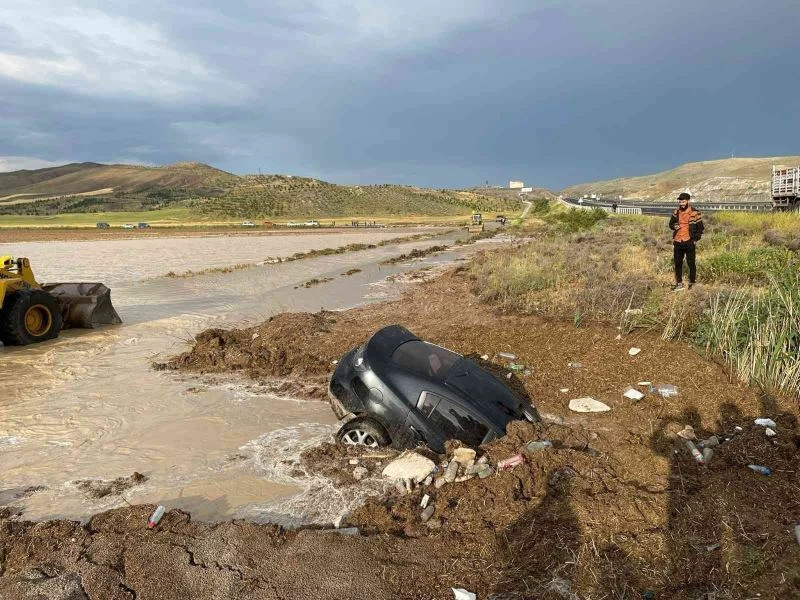 Ankara’nın Polatlı ilçesinde etkili olan sağanak yağış sele neden oldu. Sel sularının sürüklediği iki araç çamura saplandı.