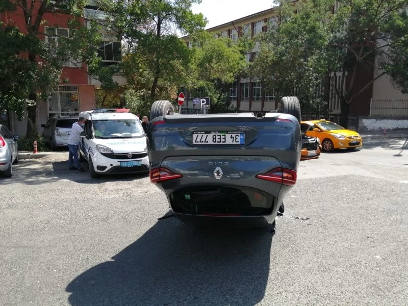 Ankara’da ticari taksi ile kavşağı dönmeye çalışan otomobil çarpıştı. Şans eseri kazada can kaybı yaşanmazken, taksideki bir yolcu hafif yaralandı.
