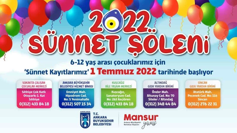 Ankara Büyükşehir Belediyesi, bu yıl 6-16 yaş arası bin çocuğu ücretsiz sünnet ettirecek. Pandemi nedeniyle 2 yıl ara verilen toplu sünnet şöleni için 1 Temmuz tarihinden itibaren başvurular alınmaya başlanacak. Aileler kayıt için Ankara Büyükşehir Belediyesi Hizmet Binası Sosyal Hizmetler Daire Başkanlığı Halka İlişkiler Bankosu, Sokakta Çalışan Çocuklar Merkezi, Kuşcağız Aile Yaşam Merkezi, Altındağ Gıda Yardım Birimi ve Sincan Gıda Yardım Birimi’ne istenilen evraklar ile başvuru yapabilecek. “(0312) 507 15 34” numaralı telefondan detaylı bilgi alabilecek olan aileler, sünnet olacak çocuklarının ve kendilerinin kimlik fotokopisi ve ikametgâh ilmühaberi ile kayıt yaptırabilecek.