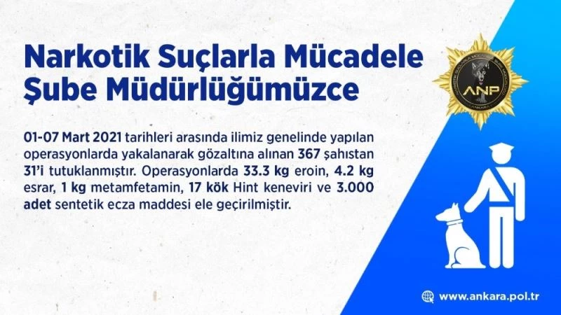 Ankara Emniyet Müdürlüğü’nün Twitter üzerinden yaptığı paylaşımda, “01-07 Mart tarihleri arasında ilimiz genelinde yapılan operasyonlarda yakalanarak gözaltına alınan 367 şahıstan 31’i tutuklanmıştır. Operasyonlarda 33,3 kilogram eroin, 4,2 kilogram esrar, 1 kilogram metamfetamin, 17 kök Hint keneviri ve 3 bin adet sentetik ecza maddesi ele geçirilmiştir” denildi.
