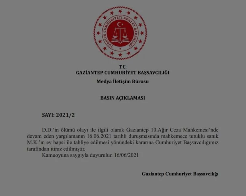 Konu ile ilgili Gaziantep Cumhuriyet Başsavcılığ’ndan yapılan açıklamada, "D.D.’in ölümü olayı ile ilgili olarak Gaziantep 10.Ağır Ceza Mahkemesi’nde devam eden yargılamanın 16.06.2021 tarihli duruşmasında mahkemece tutuklu sanık M.K.’ın ev hapsi ile tahliye edilmesi yönündeki kararına Cumhuriyet Başsavcılığımız tarafından itiraz edilmiştir. Kamuoyuna saygıyla duyurulur" ifadelerine yer verildi.