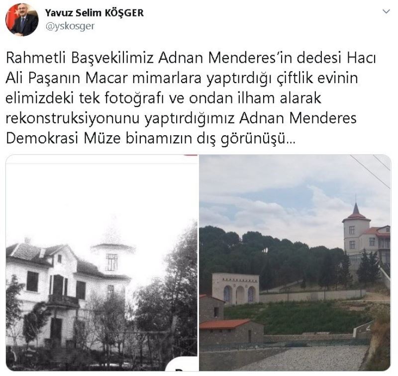 Aydın Valisi Yavuz Selim Köşger konu ile ilgili olarak sosyal medyadan konağın eski ve yaptırılan müzenin fotoğrafının bulunduğu paylaşımında “Rahmetli Başvekilimiz Adnan Menderes’in dedesi Hacı Ali Paşanın Macar mimarlara yaptırdığı çiftlik evinin elimizdeki tek fotoğrafı ve ondan ilham alarak rekonstrüksiyonunu yaptırdığımız Adnan Menderes Demokrasi Müze binamızın dış görünüşü” açıklamasında bulundu.