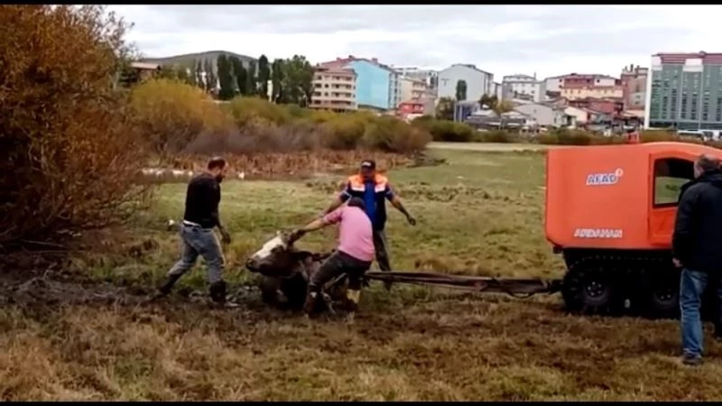 Ardahan’da bataklığa saplanan inek, AFAD ekiplerinin 1 saatlik mücadelesinin ardından kurtarıldı.