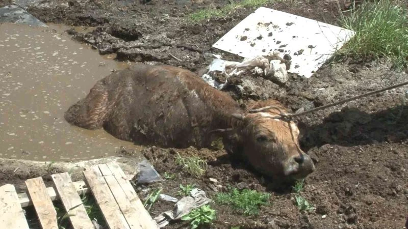 Bataklığa saplanan inek ve yavrusunu itfaiye kurtardı
