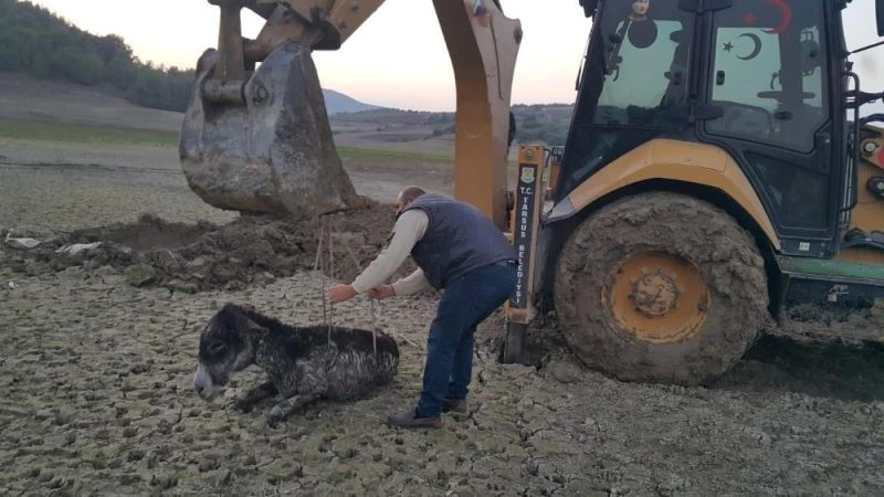 Mersin’in Tarsus ilçesinde bataklığa saplanan yaralı eşek, ekiplerin ortak çalışmasıyla kurtarıldı.