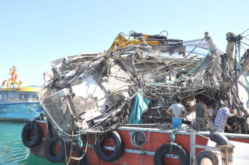 Sinop’ta içerisinde bulunan 4 kişi ile birlikte batan “Alperen57” isimli balıkçı teknesi ekiplerin gözetiminde denizden çıkarıldı
