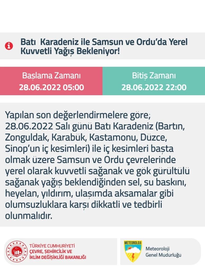 Meteoroloji Genel Müdürlüğünden 28 Haziran için yapılan uyarıda, Bartın, Zonguldak, Karabük, Kastamonu, Düzce, Sinop’un iç kesimleri başta olmak üzere Samsun ve Ordu çevrelerinde yerel olarak kuvvetli sağanak ve gök gürültülü sağanak bekleniyor” ifadelerine yer verildi.