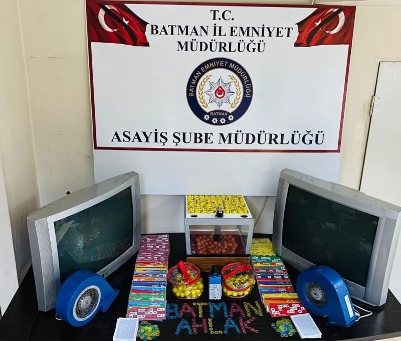 Batman il Emniyet Müdürlüğünden yapılan açıklamada, Asayiş Şube Müdürlüğü Ahlak Büro Amirliği ekiplerinin kent genelinde kumar oynatılan yerlere ve kumar makinelerine yönelik operasyon gerçekleştirdiği belirtildi. Açıklamada, "19 Mayıs Mahallesinde kıraathane olarak kullanılan bir adreste tombala olarak tabir edilen kumar oyunu oynatıldığı bilgisi alınmış, yapılan operasyon neticesinde 16 kişi kumar oynadığı tespit edilerek, şahıslara toplam 17 bin 363 lira idari para ceza uygulanmıştır. Kumar oynattığı tespit edilen 3 şahsa ise kumar oynanması için yer ve imkan sağlama ve 1072 sayılı rulet, tilt, langırt ve benzeri oyun aletleri ve makineleri hakkında kanun maddesi kapsamına giren suçlardan adli işlem başlatılmıştır. Ayrıca kumar oyununda kullanılan 2 adet tüplü televizyon, 1 adet tombala makinesi, 2 adet üfleme motoru, 1 adet kamera, 199 adet tombala kartı, 263 adet pinpon topu, 2 bin adet çay puluna el konulmuştur. Batman halkının huzuru için suç ve suçlular ile mücadelemiz bundan önce olduğu gibi bundan sonra da 7 gün 24 saat kararlılıkla sürdürülecek olup, en büyük destekçimiz olan vatandaşlarımızın özellikle 112 acil çağrı merkezimizi arayarak gösterecekleri destek çok kıymetlidir. Suç ve suçlularla mücadelemizde kuşkusuz bu bilgiler çok önemli olup, bizlere yardımcı olmaktadır. İl Emniyet Müdürlüğümüze bağlı ekipler tarafından günün 24 saatinde tüm il genelinde kontrollerimiz kararlıkla devam etmektedir" denildi.
