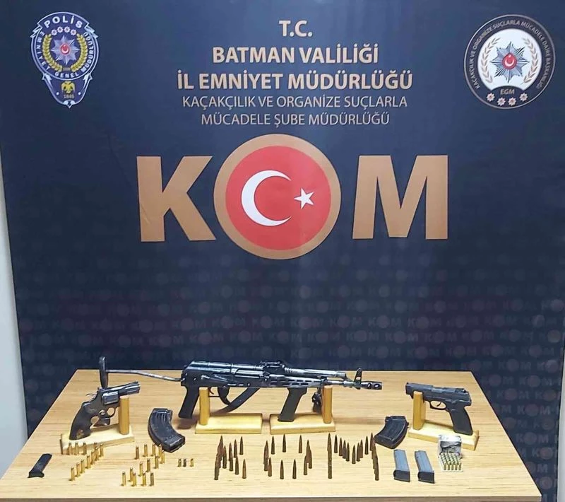 Batman Emniyet Müdürlüğü Kaçakçılık ve Organize Suçlarla Mücadele Şube Müdürlüğü tarafından düzenlenen operasyonda 1 adet uzun namlulu silah, 7 adet tabanca ve çok sayıda fişek yakalandı.