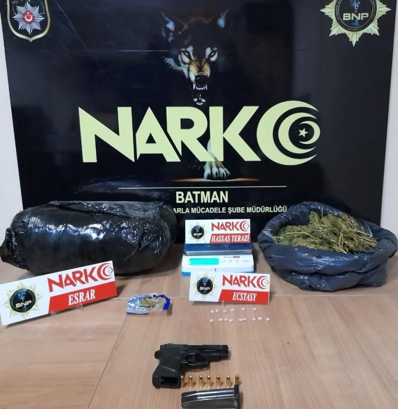 Batman İl Emniyet Müdürlüğünden yapılan açıklamada, uyuşturucu madde ticareti yapan ve kullanan şahıslara yönelik çalışma yapıldığı belirtildi. Açıklamada, Korik Mahallesi’nde bulunan adreste yüklü miktarda uyuşturucu madde olduğunun tespit edilmesi üzerine ikamette yapılan aramada 6 kilo 190 gram kubar esrar maddesi, 15 ecstacy uyuşturucu hap, bir hassas terazi, çok sayıda uyuşturucu madde paketlemede kullanılan şeffaf poşet ve bir ruhsatsız tabanca ele geçirildiği ifade edildi.