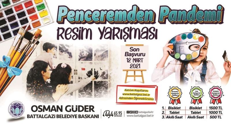 Battalgazi Belediyesi’ne bağlı Kültür ve Sosyal İşler Müdürlüğü, içerisinde bulunduğumuz korona virüs süreciyle birlikte insanların değişen yaşam tarzlarını, alışkanlıklarını, sınırlanan sosyal çevrelerindeki bakış açılarını ve iletişim biçimlerini görsel sanatlar yoluyla ifade edebilmelerine destek olmak amacıyla, 3 kategoride “Penceremden Pandemi” konulu resim yarışması düzenlenecek. Ortaokul, Lise ve Yetişkinler kategorisinde düzenlenecek olan resim yarışmasının başvuruları 5 Şubat 2021 tarihinde başlarken, 12 Mart 2021 tarihinde ise başvurular son bulacak. 18 yaş üzeri tüm sanatseverlerin de katılımına açık olacak olan yarışmaya, resmi ve özel okullarda eğitim gören ilkokul, ortaokul ve lise öğrencileri de ücretsiz olarak başvuru yapabilecek. Yarışmaya katılanların seçtikleri bir tema üzerinden yaptıkları resimleri belirtilen tarihler arasında Battalgazi Belediyesi Kültür ve Sosyal İşler Müdürlüğü’ne başvuru formu ile birlikte bir adet eserlerini elden veya kargo ile teslim edebilecek. Resim yarışmasının ödül töreni ise 22 Mart tarihinde gerçekleştirilecek.