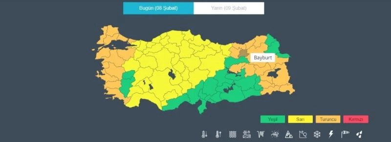 Meteoroloji Genel Müdürlüğü’nden yapılan uyarıya göre Bayburt’un da aralarında bulunduğu 34 şehir için kuvvetli rüzgâr, 28 şehir için rüzgâr, sel ve çığ beklenildiği belirtilerek, vatandaşlara uyarılarda bulunuldu.