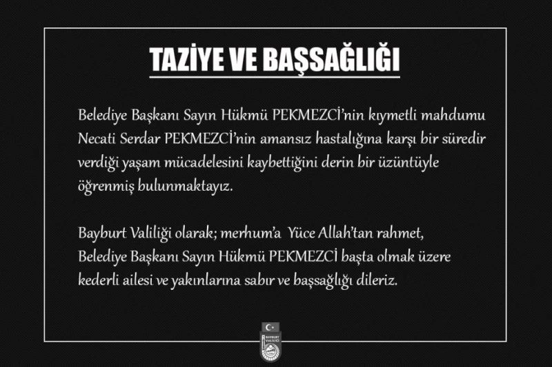 Bayburt Valiliği olarak; merhuma yüce Allah’tan rahmet, Belediye Başkanı Hükmü Pekmezci başta olmak üzere kederli ailesi ve yakınlarına sabır ve baş salığı dileriz” ifadelerine yer verildi.