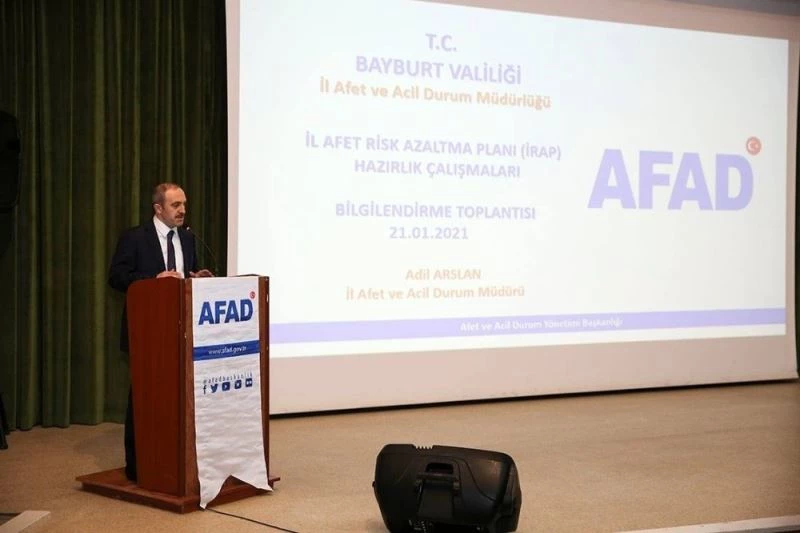 Toplumda afet farkındalığın geliştirilmesi, afet risklerinin azaltılması ve önlem alınması konusunda davranış değişikliği oluşturulması maksadıyla 2021 yılı, İçişleri Bakanlığı tarafından Türkiye Afet Eğitim Yılı olarak ilan edildi. Afet Eğitim Yılı çalışmaları doğrultusunda ülke genelinde Afet Risk Azaltma Planı çalışmalarına başlandı. İller bazında hazırlıklarına başlanan planlara ek olarak çeşitli başlıklar altında düzenlenecek eğitimler ile Afet Eğitim Yılı’nda vatandaşların afetlere ilişkin farkındalığının artırılması sağlanacak. Bayburt’ta bu kapsamda İRAP Hazırlık çalışmalarına yönelik bilgilendirme toplantısı düzenlendi.