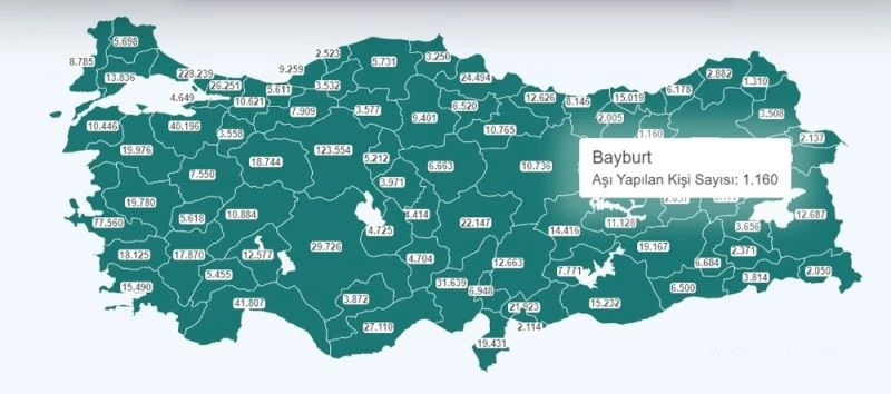 Sağlık Bakanlığı’nca yeni tip korona virüse karşı Türkiye’de aşılanma rakamları yayınlanmaya başlandı. İller bazında aşı dağılımına göre 25 Ocak 2021 Pazartesi saat 08. 45 itibariyle Bayburt’ta bin 160 kişi aşılandı.