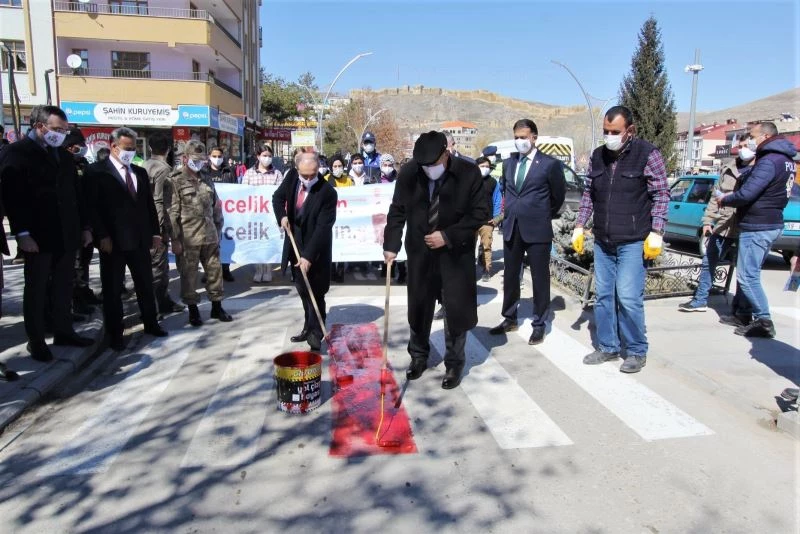 Bayburt’ta “Yaya Önceliği Kırmızı Çizgimizdir” sloganıyla yaya geçidine kırmızı çizgi çekildi.