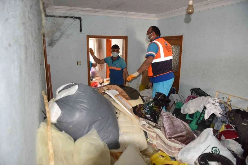 Bursa-Yıldırım Belediyesi, çöp yığınına dönen evi temizleyerek dezenfekte etti.