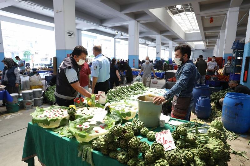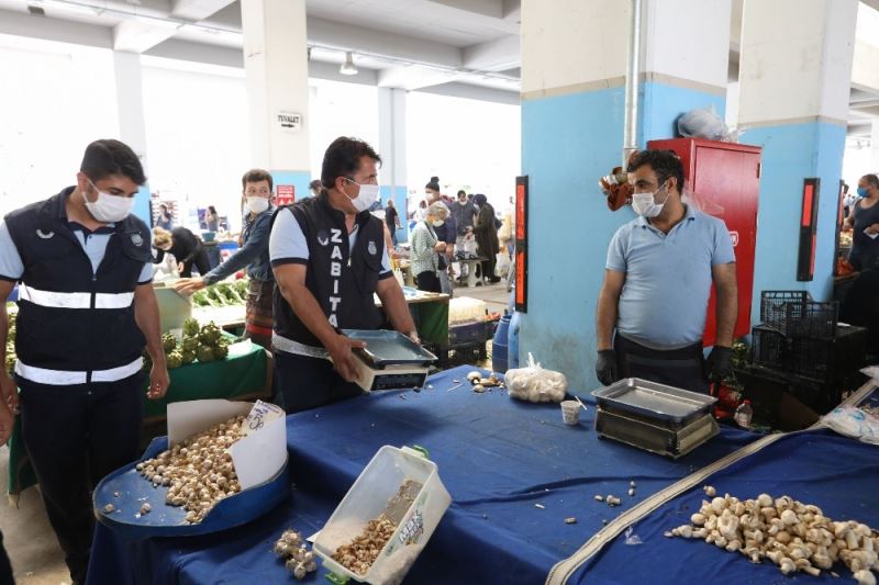 Pandemi önlemlerinin yanı sıra zabıta ekipleri pazar içinde de denetimlerine devam etti. Gün boyu alanda tur atan ekipler, esnafın tartılarını kontrol etti. Tezgahlarda gram, yarım kilo gibi vatandaşta yanlış algı oluşturmaya yönelik etiketler kontrol edilerek kaldırtıldı. Özellikle şarküteri ürünlerinin açıkta satılmaması ve seçmece alışverişe karşı uyarılar yapıldı.