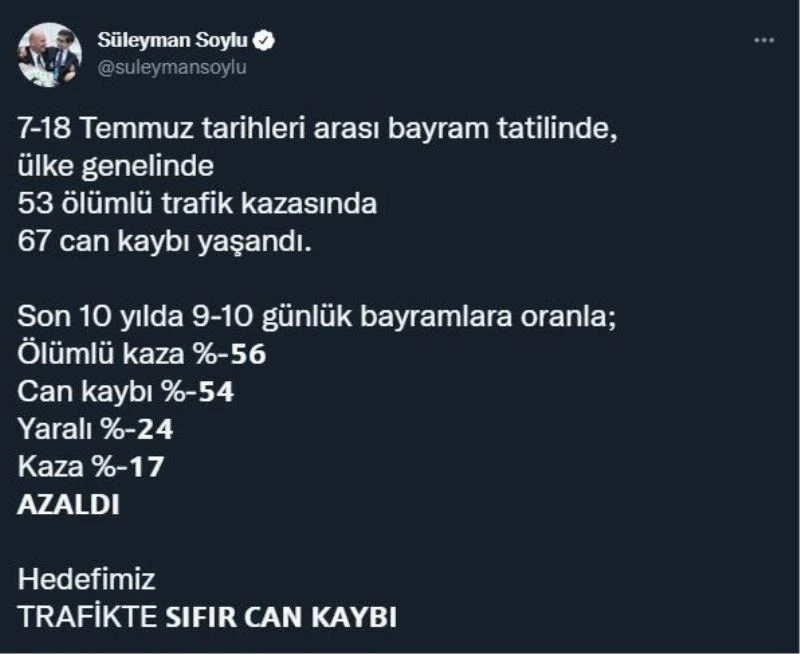 İçişleri Bakanı Süleyman Soylu sosyal medya adresi üzerinden bayram tatilinde yaşanan ölümlü kaza ve can kaybı sayısını açıkladı. Soylu’nun açıklamasına göre 7-18 Temmuz tarihleri arasında ülke genelinde 53 ölümlü trafik kazası yaşanırken, 67 kişi hayatını kaybetti. Öte yandan, son 10 yılda 9-10 günlük bayramlara oranla ölümlü kaza yüzde eksi 56, can kaybı yüzde eksi 54, yaralı yüzde eksi 24 ve kazaların ise yüzde eksi 17 azaldığını açıklayan Bakan Soylu paylaşımında “Hedefimiz trafikte sıfır can kaybı” ifadelerini kullandı.