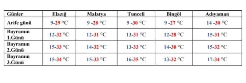 Meteoroloji, Elazığ, Malatya, Adıyaman, Tunceli ve Bingöl’de, Ramazan Bayramı’nda hava sıcaklığının 2 ile 4 derece mevsim normalleri üzerinde seyredeceğini, son günü ise 34-35 dereceyi göreceğini bildirdi.