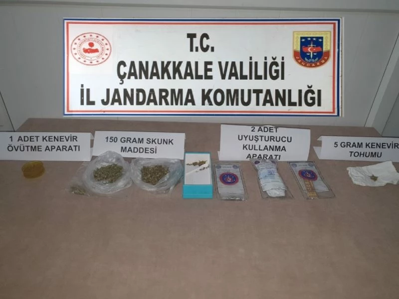 Çanakkale İl Jandarma Komutanlığı ekipleri, uyuşturucu madde ticareti yapan ve kullanan şahıslara yönelik sürdürdükleri araştırmalar kapsamında Bayramiç ilçesinde bir eve operasyon düzenlendi. Yapılan operasyonda; 150 gram skunk maddesi, 5 gram kenevir tohumu, 2 adet uyuşturucu kullanma aparatı, 1 adet Kenevir öğütme aparatı ele geçirilirken, 2 kişi de gözaltına alındı.