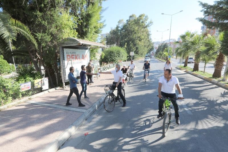 MERSİN (İHA) – Mersin’de merkez ilçe Mezitli Belediye Başkanı Neşet Tarhan, bisikletine atladı, sokak sokak gezerek vatandaşlara maske dağıttı. Korona virüs salgını nedeniyle bu yıl Avrupa Hareketlilik Haftası etkinliklerini, birkaç belediye çalışanıyla birlikte gerçekleştirdiği etkinlikle kutlayan Başkan Tarhan, hem bisiklet kullanımına dikkat çekmek hem de maske dağıtarak farkındalık oluşturmak istediklerini söyledi.