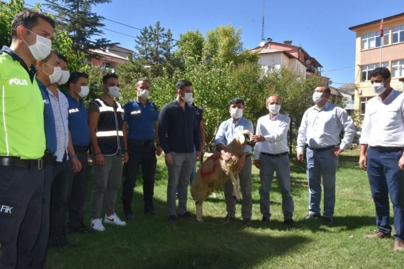 Adana’nın Tufanbeyli Belediye Başkanı Remzi Ergü, ilçede görev yapan emniyet mensuplarının bayramını tebrik ederek kurbanlık koyun hediye etti.