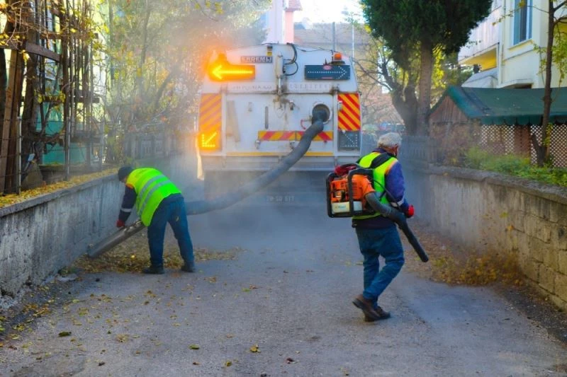 Ekipler, vakumlu yol süpürme araçları ve yaprak toplama araçlarıyla cadde ve meydanlarda yaprakların yağmur suyu kanallarını tıkamaması için her gün temizlik yapıyor.