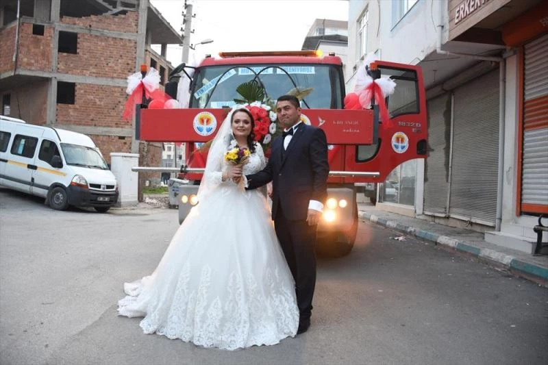 Belediyenin Temizlik Şube Müdürlüğünde görevli Mustafa Uzel, hayatını birleştireceği Pınar Öztaş'a sürpriz yapmak için biriminden izin alarak, kullandığı temizlik aracını gelin arabası gibi süsletti.