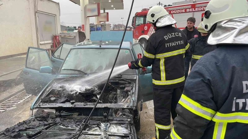 DÜZCE – Düzce’de benzin istasyonunda motor kısmından tutuşan otomobil korkuttu.