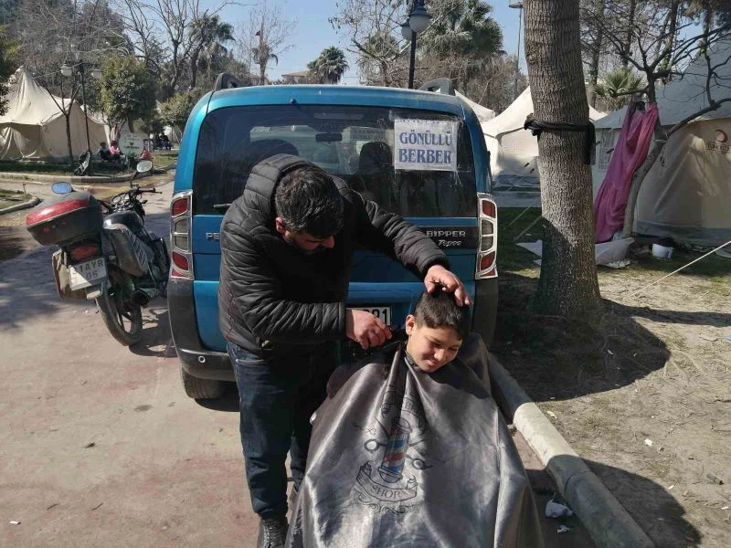 İstanbul Sultanbeyli’deki dükkanını kapatıp Hatay’a gelen berber Cengiz Demircan, burada yaklaşık bir haftadır depremzedelere ücretsiz hizmet veriyor.