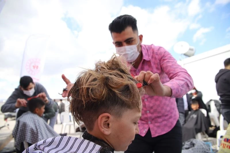 Elazığ depreminden sonra geçici barınma merkezi olarak hazırlanan konteyner kentlerde aileleri ile yaşayan çocuklar için aynı anda 13 berber ücretsiz olarak hizmet verdi. Çocukların saçlarını kesen berberler, isteklerine göre de şekillendirmeyi ihmal etmedi.