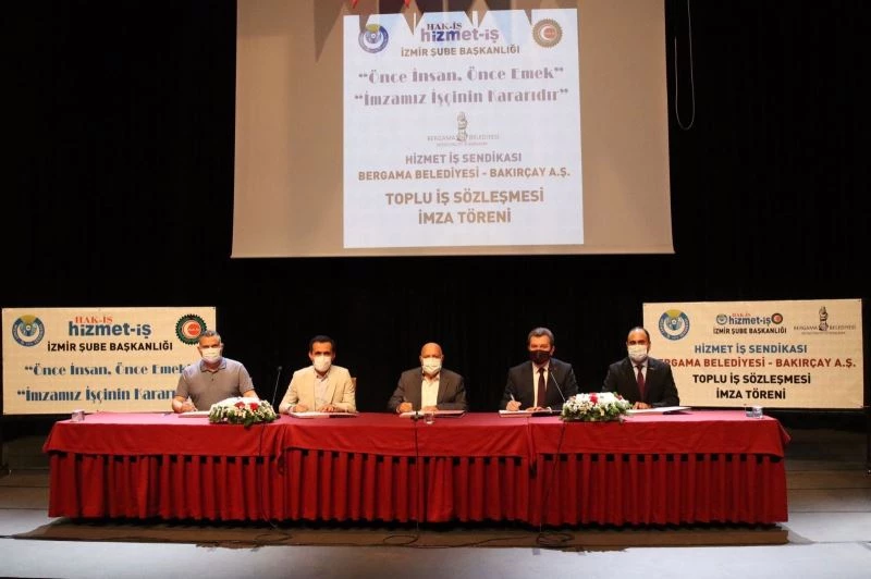 Bergama Kültür Merkezi’nde düzenlenen imza törenine ayrıca; Belediye Başkan Yardımcıları Cüneyt Umutlu, Aşkın Uyar ve işçiler katıldı.
