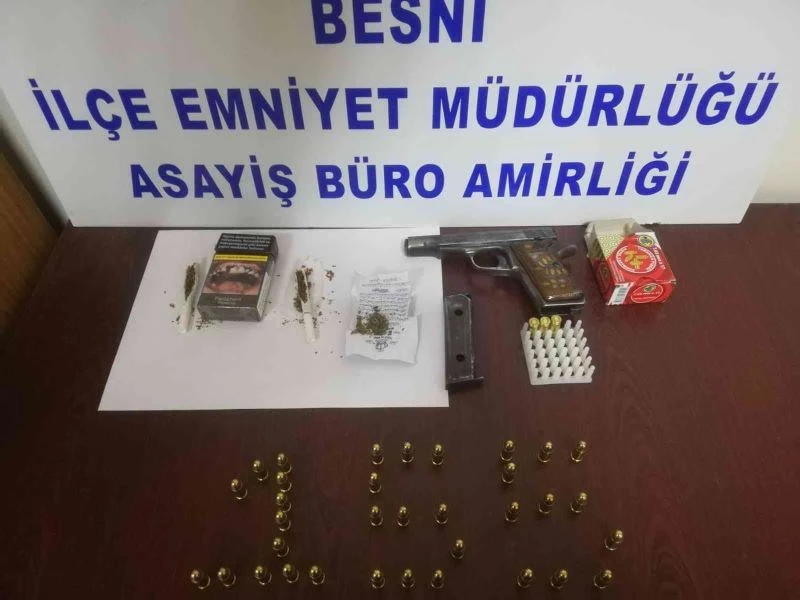 Edinilen bilgilere göre, Besni ilçe Emniyet Müdürlüğüne bağlı Asayiş Büro Amirliği ile Narkotik Suçlarla Mücadele Büro Amirliği ekipleri tarafından ilçe merkezinde yapılan denetimler kapsamında durumundan şüphelenilen bir otomobil durdurularak incelendi. Yapılan incelemelerde sigara paketi içerisinde 5 gram esrar maddesi ile araçta 1 adet ruhsatsız tabanca ve bu tabancaya ait 35 adet mermi ele geçirildi. Ele geçirilen malzemeler muhafaza altına alınırken araçta bulunan T.G., S.E., S.S., ve S.G., isimli 4 şahıs hakkında işlem başlatıldı.