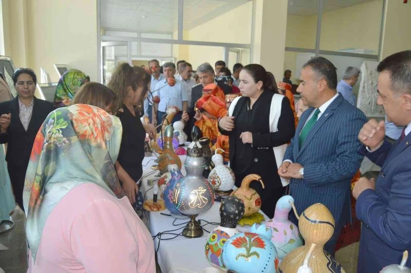 Konuşmaların ardından Besni Halk Eğitimi Merkezi bünyesinden açılan kurslarda yapılan el emeği göz nuru ürünler sergilendi.