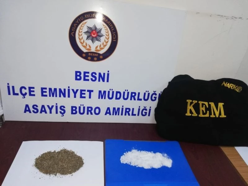 Edinilen bilgilere göre, Besni ilçe Emniyet Müdürlüğüne bağlı polis ekipleri ile ilçe Jandarma Komutanlığı ekipleri tarafından yapılan ortak çalışmalar sonucunda Gaziantep’ten Besni istikametine gelen bir araç durdurularak arandı. Hassas burunlu narkotik köpeği olan ‘Miror’ ile araç içerisinde yapılan aramalarda yaklaşık 50 gram ağırlığında metamfetamin maddesi ile bonzai maddesi ele geçirildi. Araç içerisine zulalanmış olan metamfetamin maddesi ile bonzai maddesine el konulurken konuyla ilgili A.A ve H.Ç., isimli 2 şahıs gözaltına alındı.