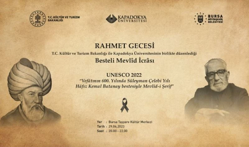 Kültür ve Turizm Bakanlığı ile Kapadokya Üniversitesi iş birliğiyle Türkiye’de yaşanan deprem felaketinin 40. gününde Cumhurbaşkanlığı Senfoni Orkestrası sahnesinde ilk kez seslendirilen Bestekâr Kemal Batanay’ın 1956 yılında bestelediği Mevlid-i Şerif (Besteli Mevlid), kaleme alındığı Bursa’da ilk kez icra edilecek.