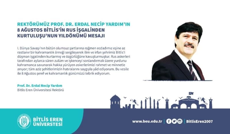 Bitlis Eren Üniversitesi (BEÜ) Rektörü Prof. Dr. Erdal Necip Yardım, 8 Ağustos Bitlis’in Rus işgalinden kurtuluşunun yıldönümü münasebeti ile bir mesaj yayımladı.