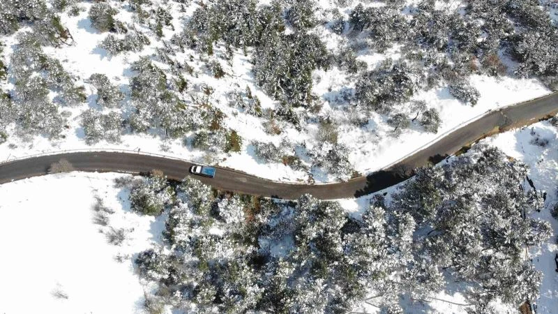 Aydos Ormanı kar yağışıyla birlikte beyaza bürünürken, ortaya çıkan seyrine doyumsuz manzara dron ile havadan görüntülendi.