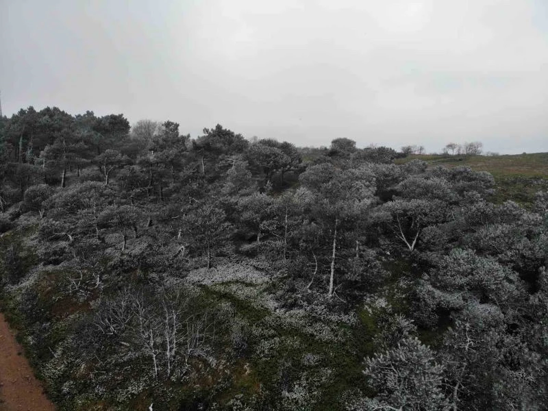 İstanbul?da beklenen kar yağışı şehrin yüksek kesimlerinde etkisini göstermeye başladı. Aydos Tepesi ve çevresindeki ormanlık alan beyaza büründü. O anlar havadan görüntülendi.