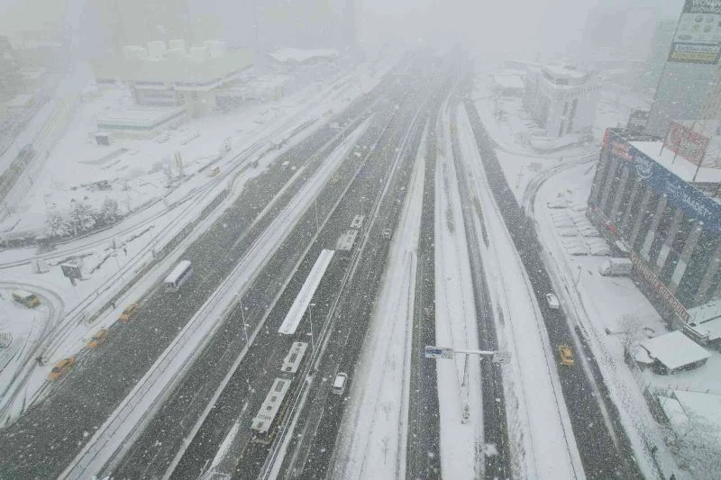İstanbul’da sabah yağan karla beyaza bürünen E-5 karayolu havadan görüntülendi.
